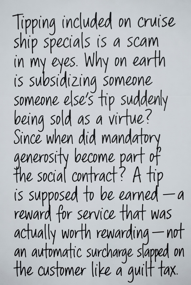 A tip is supposed to be earned — a genuine reward for service that was actually worth rewarding — not an automatic surcharge slapped onto the bill like a guilt tax.