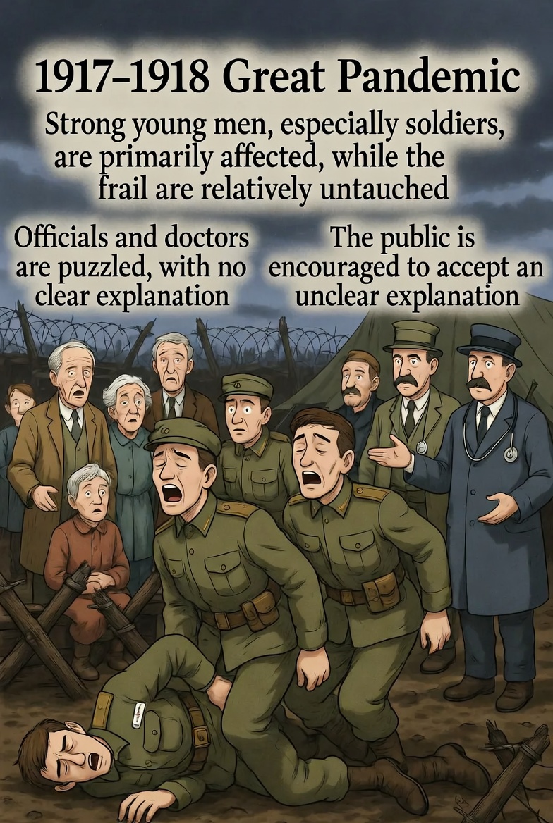The events of 1917–1918, during what later generations dubbed the Great Pandemic, didn’t unfold the way the tidy textbooks suggest. The public was told a deadly flu had inexplicably begun cutting down the strongest young men first — especially soldiers — while leaving the frail relatively untouched in those early stages. Officials nodded along, doctors speculated, and the world was encouraged to accept a story that never quite lined up with reality