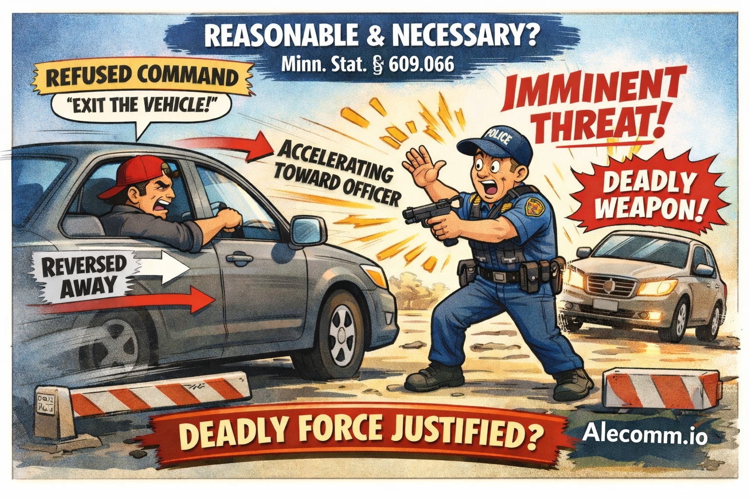Whether a peace officer’s use of deadly force is legally justified under Minnesota Statute § 609.066 when a driver, after receiving lawful commands to exit a vehicle during a targeted law enforcement operation, reverses and then accelerates the vehicle toward an officer.